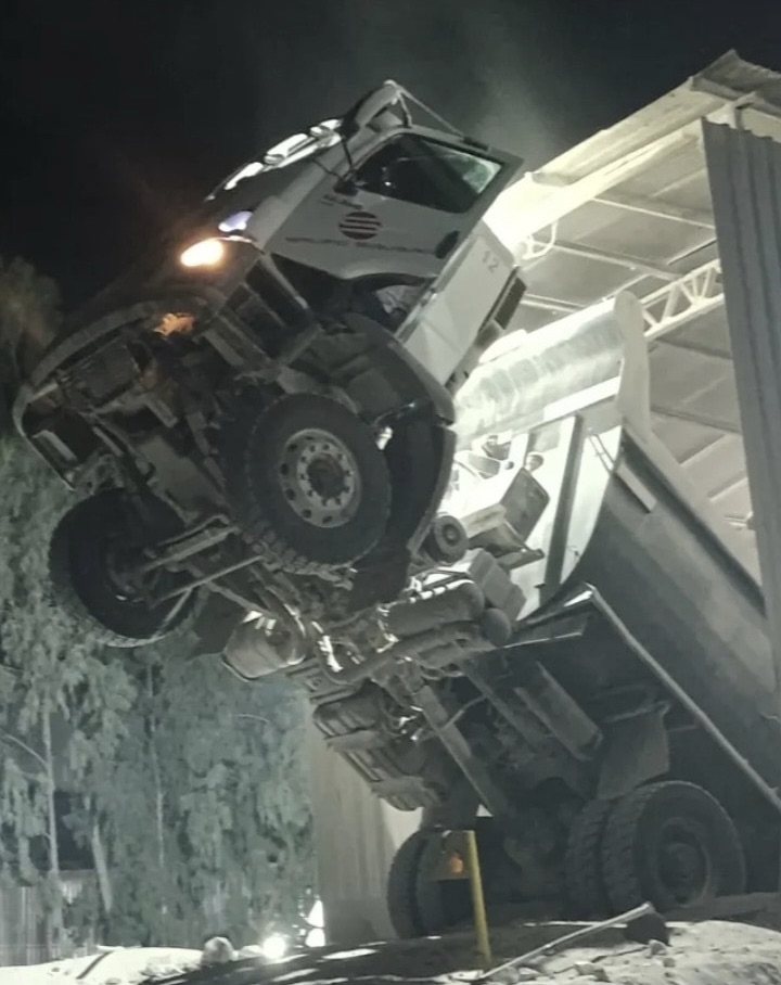 Um susto daqueles foi registrado por volta das 4h da manhã deste domingo, 13 de julho, em uma fábrica de gesso localizada no município de Ipubi. Um caminhão que realizava o descarregamento de pedra em uma trincheira acabou ficando completamente suspenso, com a cabine erguida e as rodas dianteiras no ar, após o motorista dar ré além do ponto seguro.
