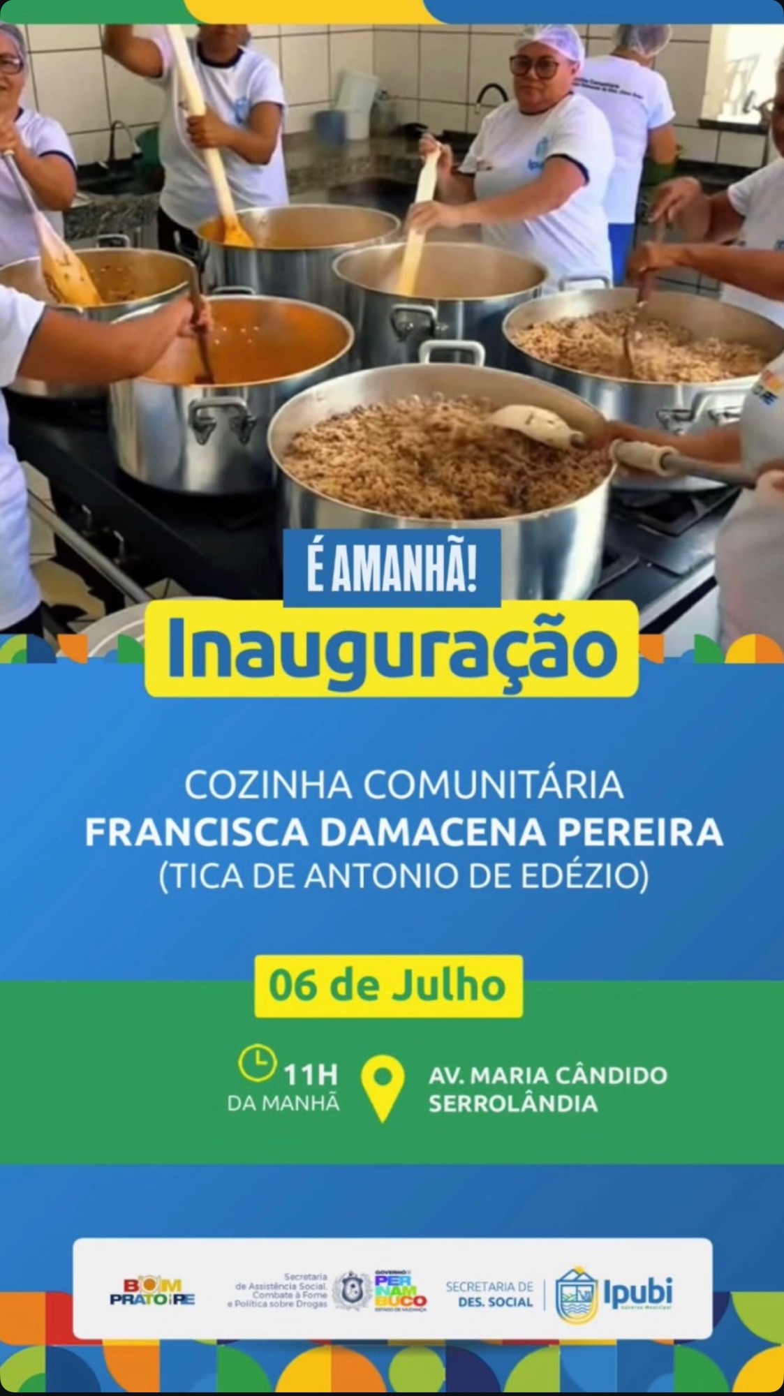 Atenção, povo de Serrolândia! Neste sábado será inaugurada oficialmente a Cozinha Comunitária Francisca Damacena Pereira, mais conhecida como Tica de Antônio de Edézio, uma iniciativa que chega para marcar a gestão de João Marcos com um gesto concreto no combate à fome.