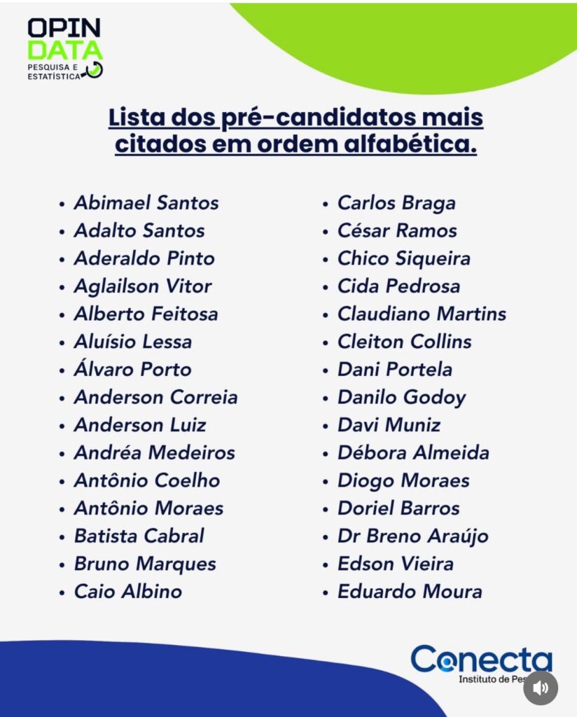 A OpenData, em parceria com a Conecta Instituto de Pesquisa, divulgou uma lista com os 100 pré candidatos a deputado estadual mais citados em Pernambuco. O levantamento ouviu 47.200 pessoas entre os dias 04 e 13 de novembro de 2025 em todas as regiões do estado e apresenta a colocação de cada nome por cotas de voto.