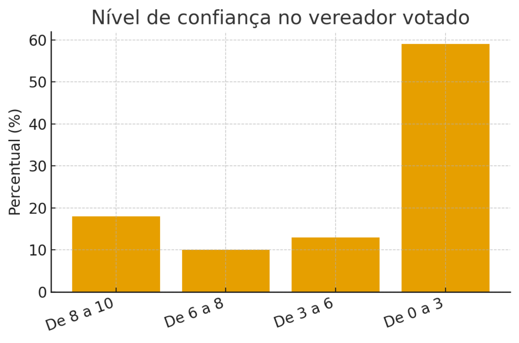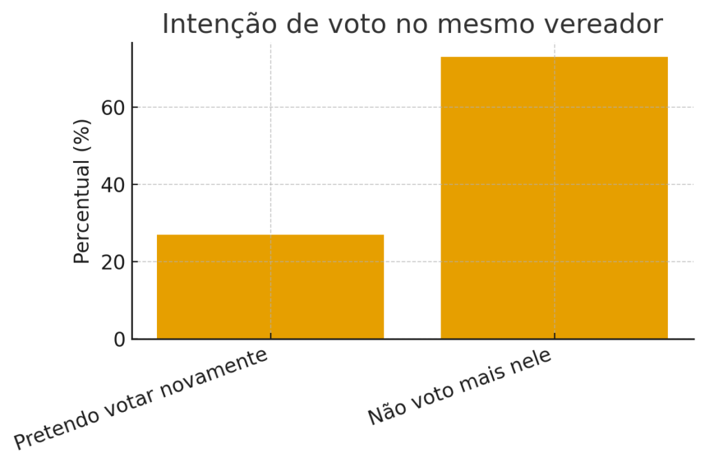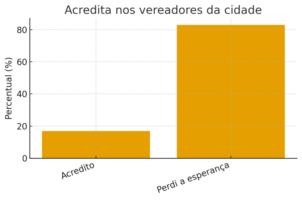 Os números mostram que 73% dos eleitores não pretendem votar novamente no mesmo vereador, enquanto 59% avaliaram com notas entre 0 e 3 o nível de confiança nos seus representantes. Além disso, 83% afirmaram já ter perdido a esperança na Câmara Municipal.